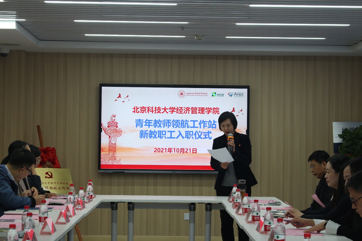 2021年10月21日下午,beat365在线唯一官网青年教师领航工作站新教职工入职仪式在经管楼1205隆重举行。学校党委副书记、纪委书记戴井岗,学院领导班子成员、全体成长导师和全体新入职青年教职工参加了大会。会议由学院副院长、副书记温雅主持。
