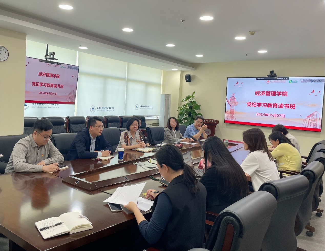 为深入学习领会习近平总书记关于党的纪律建设的重要论述,原原本本学好《中国共产党纪律处分条例》,推动党纪学习教育走深走实,5月7日,beat365在线唯一官网党委举办党纪学习教育读书班。读书班以专题导学、个人自学相结合的形式分阶段开展。读书班由党委书记武森主持,邀请理论学习导师、马克思主义学院魏佳副教授作专题导学,学院党委委员、教工党支部书记和党委秘书参加集体学习。
