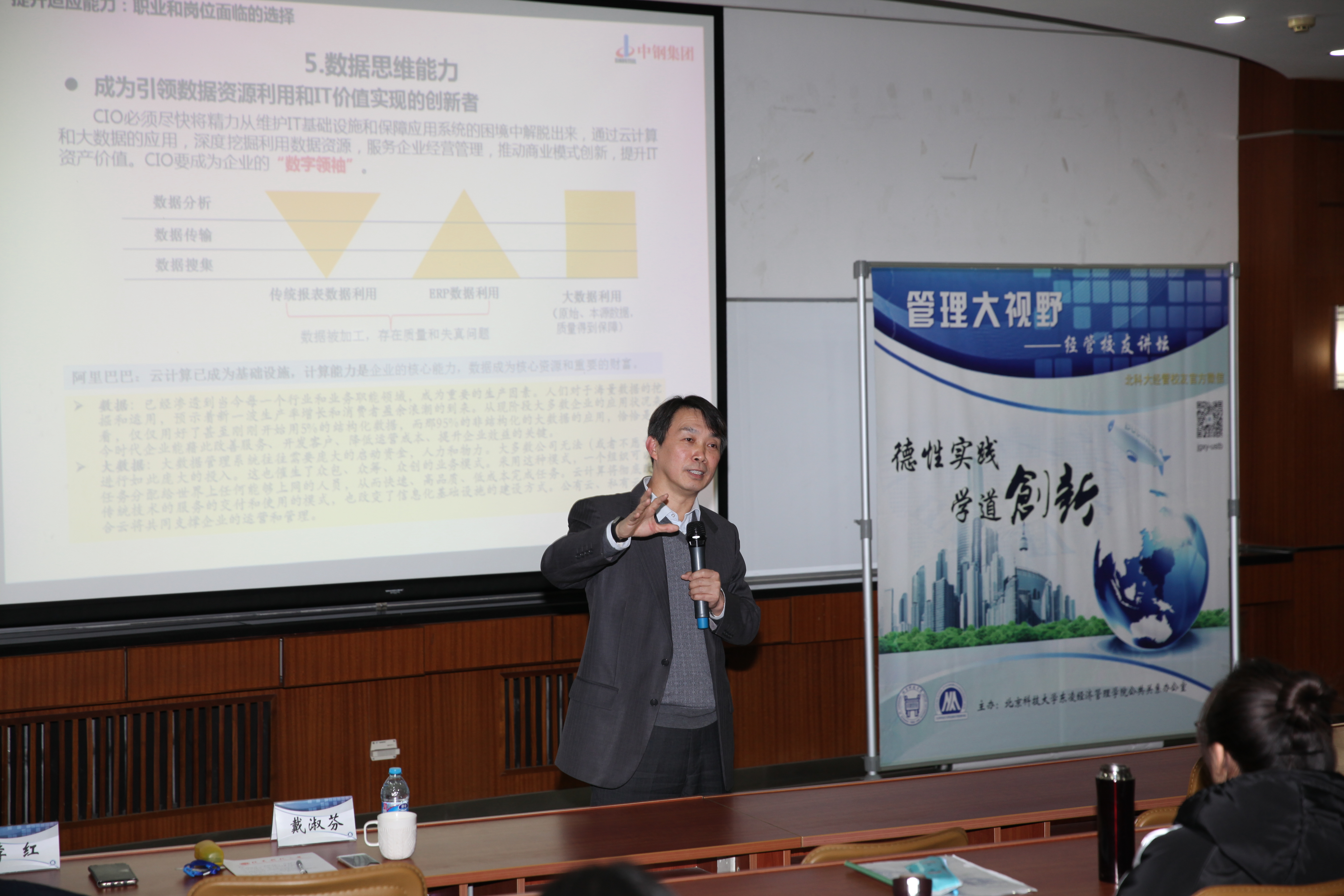下午3:30活动开始。党委书记戴淑芬介绍了主讲校友和经管校友讲坛系列活动后,讲座开始。李红校友在原冶金工业部规划发展司工作16年,从事钢铁行业计划和统计工作,担任过统计研究处处长;2000至今,已在中钢集团工作16年,先后担任过综合管理部、信息管理部、运营改善部和信息管理中心负责人。现兼任国家网络与信息安全信息通报中心专家组专家、全国智能制造发展联盟专家委员会委员、中国电子学会中国大数据专委会委员等职务。讲座中,李红校友将自己在工作中积累的丰富经验和对企业转型的理解,深入浅出的与在场听众进行了分享。他认为,新一代信息技术是现代企业转型的核心动力和新动能。互联网+促使企业重塑产业链、价值链和生态链;云计算构建了企业新的IT基础设施,新的信息化模式;大数据是企业新资源、新资产、新财富、新的竞争力;移动互联为企业对外合作与商业模式创新发展新平台;电子商务是企业营销创新和增值服务必然趋势。