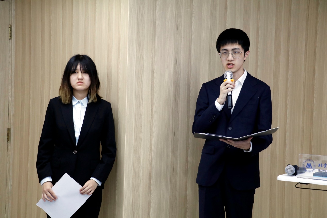 主持人学院校友与基金办公室主任秦艺芳首先介绍了与会嘉宾:学院管研86级校友、北京中泰正德投资有限公司董事长王昕,学院工贸89级校友、北京伯润德贸易有限公司总经理刘兴宇,学院EMBA16级校友、北京康乐卫士生物技术股份有限公司董事郝春利,学院党委书记武森,学院金融工程系副主任汪刘凯,学院创新创业辅导员方天群。