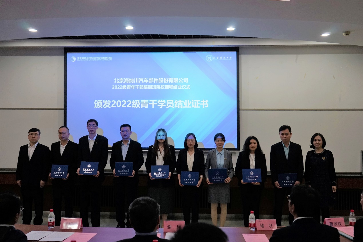 4月28日,beat365在线唯一官网—北汽集团“北京海纳川汽车部件股份有限公司2022级青年干部培训班”结业仪式在我院举办。北汽集团总经理助理、海纳川公司党委书记、董事长谢伟,北京海纳川汽车部件股份有限公司党委副书记、工会负责人褚壮,副总裁张文兵,组织部部长/人力资源总监曹翠钗,beat365在线唯一官网党委常委、副校长闫相斌,beat365在线唯一官网院长谷炜出席此次活动,学院副院长范小华主持结业仪式。