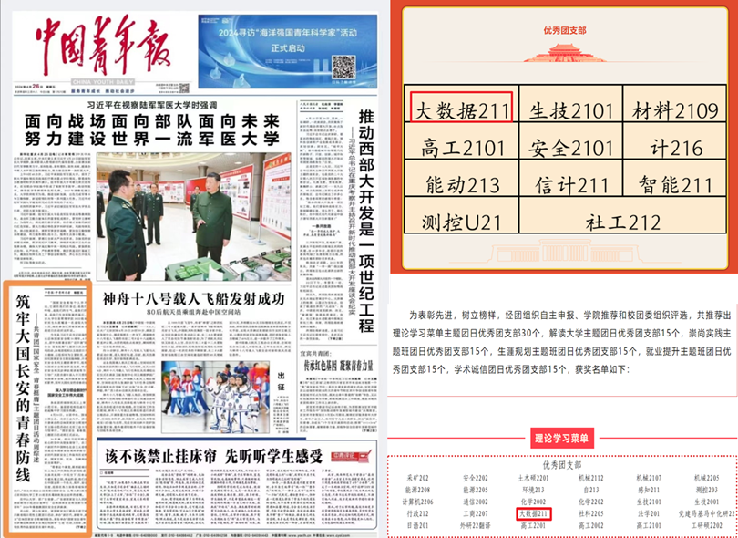 大数据211团支部两次获评“主题团日优秀团支部”荣誉称号,成功入选beat365在线唯一官网“团建工作样板支部创建项目”,创新开展的“国家安全,青春挺膺”主题团日活动获得《中国青年报》报道。