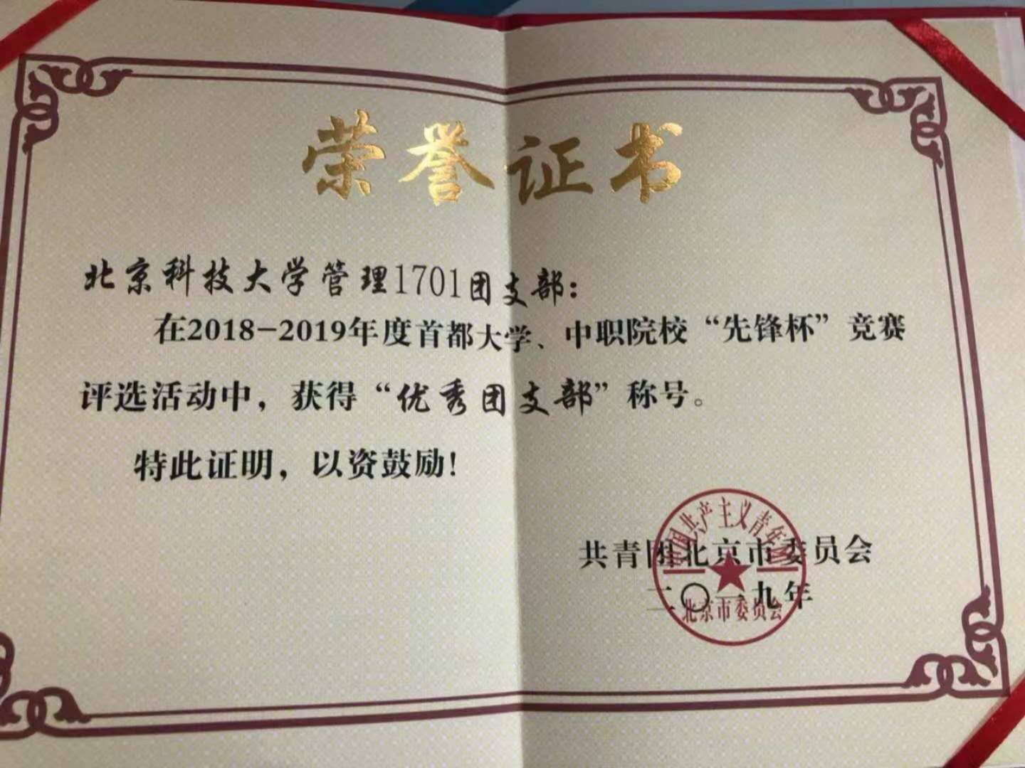 团支部荣获2018-2019年度首都大学、中职院校“先锋杯”优秀团支部、beat365在线唯一官网2019-2018和2017-2018年度优秀集体称号以及优秀团支部荣誉称号,支部一直在努力和奋斗,立志从普通走向优秀,从优秀走向卓越。