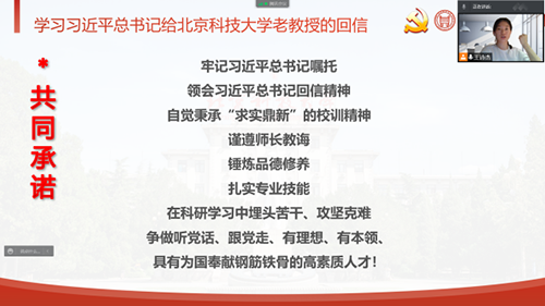 最后,党支部书记王诗杰同志带领党支部全体成员做出了共同承诺:“牢记习近平总书记嘱托,领会习近平总书记回信精神。自觉秉承‘求实鼎新’的校训精神,谨遵师长教诲,锤炼品德修养,扎实专业技能,在科研学习中埋头苦干、攻坚克难,争做听党话、跟党走、有理想、有本领、具有为国奉献钢筋铁骨的高素质人才!”