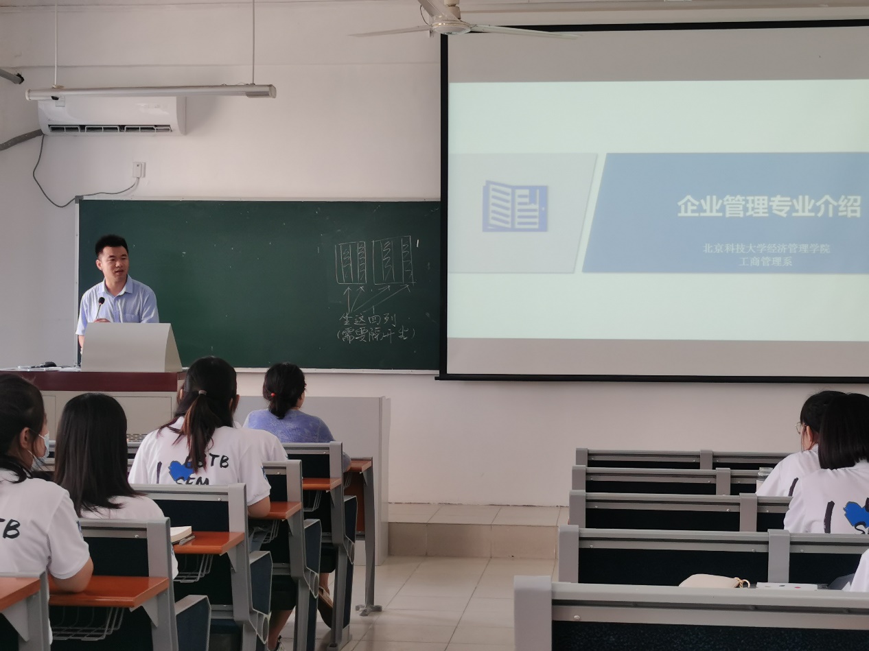 第三项,企业管理专业介绍会。班主任尹奎从专业简介、培养目标、培养资源、培养要求、就业发展等五个方面对企业管理专业进行了详细的介绍,并耐心回答了同学们提出的问题。系主任张剑则重点阐述了未来发展过程中“长期”和“短期”的问题,她表示薪资水平和工作劳累程度是成正比的,对未来发展要有长期的规划。