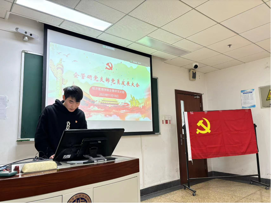 2023年11月18日15:00,企管研党支部顺利开展党员发展大会。此次活动在经管楼504开展,会议由企管研党支部书记蔡月好主持。本次会议应到党员38名,其中正式党员34名,预备党员4名,实到会正式党员32名,预备党员4名,因病因事请假2名,实到会正式党员人数超过支部有表决权党员的半数以上,符合发展大会开展要求。