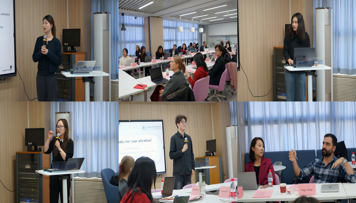 本次论坛中,12位博士生依次分享了各自最新研究成果。利兹大学商学院的Minghao Xu探讨了AI在捐赠框架中的视角偏差问题;北科大的Jiayu Chen基于门诊服务数据分析了性别在工作负荷管理中的差异。其他议题还涵盖社交媒体不文明行为中的旁观者干预、集体主义对AI接受度的影响、数字绿色融合创新模式、算法控制与自我领导、经济不平等与有机价格溢价、创业生态系统对创新驱动型企业战略的影响等。每场报告后设有5分钟互动问答,现场气氛热烈,观点交锋频繁,充分体现了跨文化、跨学科交流的深度与广度。