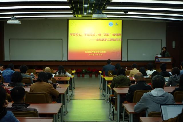 2019年10月24日星期四下午3点半,东凌beat365在线唯一官网全体教职工专题理论学习会在经管楼313举行。学院党委邀请学校纪委副书记、监察室主任兼巡察办主任吴豪伟为全体教职工作题为“不忘初心、牢记使命,做‘四有’好老师”专题教育报告,会议由学院党委书记武森主持。
