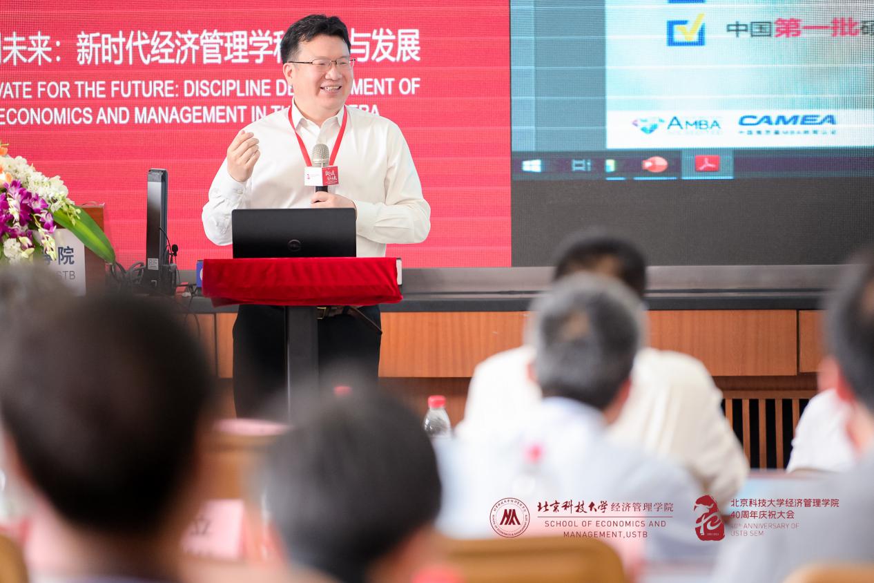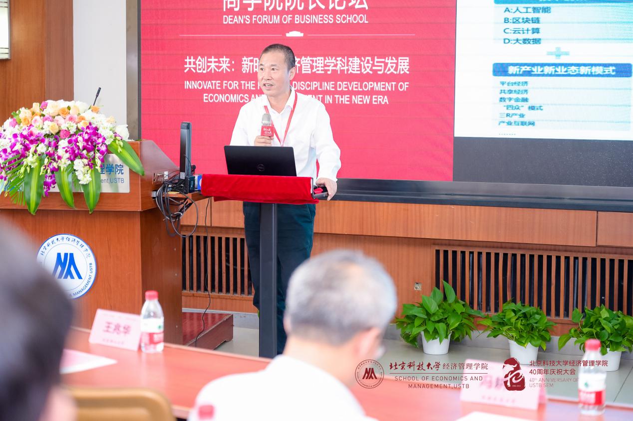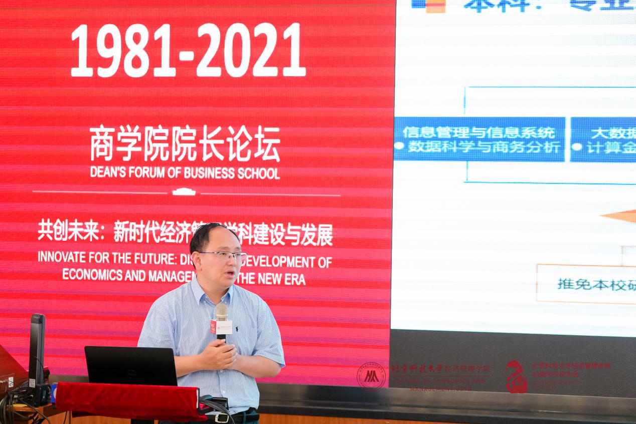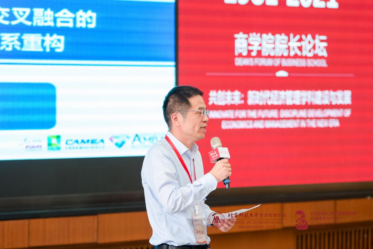 beat365在线唯一官网院长闫相斌教授为论坛致辞。闫院长首先代表学院向支持和参加此次论坛的各兄弟院校院长、嘉宾、校友、老师和同学们表示热烈的欢迎和衷心的感谢!随后,闫院长从“数字化”新时代背景出发,基于经济和社会发展对复合型人才培养的要求,提出各商学院在加速推动我国经济数字化进程和产业链创新方面大有可为。最后闫院长表示,希望借此论坛学习各兄弟院校在新时代下建设和发展经济管理学科的宝贵经验,强化北科经管教育内涵,完善学科培养体系,提升办学质量,迈向更高的台阶。