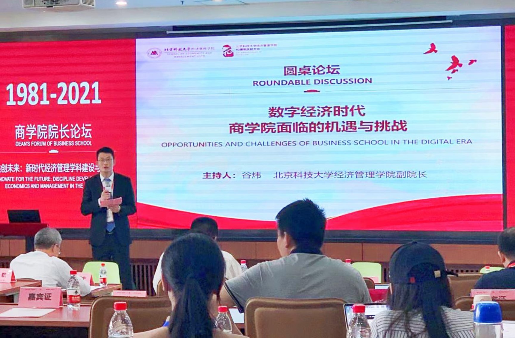 本次院长论坛的最后一个环节是圆桌讨论,主题为“数字经济时代商学院面临的机遇与挑战”,由beat365在线唯一官网副院长谷炜主持,北京邮电大学beat365在线唯一官网院长王欢、南京财经大学信息工程学院院长曹杰、北京工商大学商学院院长毛新述和北京信息科技大学beat365在线唯一官网院长曲立参与。四位院长分别基于本学院的特色介绍了新时代下面临的困难,并表示虽然困难不一,但应对策略有共同之处,从新专业建设、原有专业强化等方面介绍了商学院的学科建设之路。