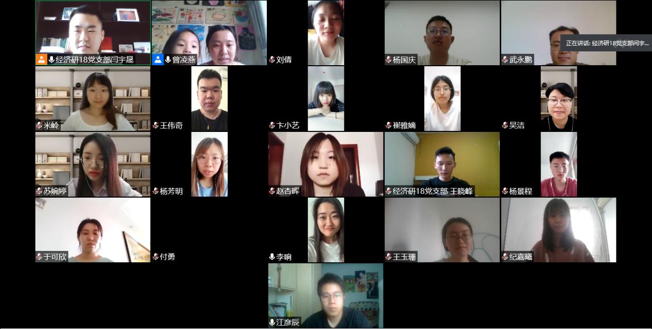 根据学院党委的统一安排,经济研18党支部全体党员于7月1日进行了2020年度“七·一”专题组织生活。活动由支部书记闫宇晟同志主持,经济研19党支部成员、学院党委曾凌燕老师和研究生辅导员李响老师参加会议。会议应到党员21名,实到党员18名。