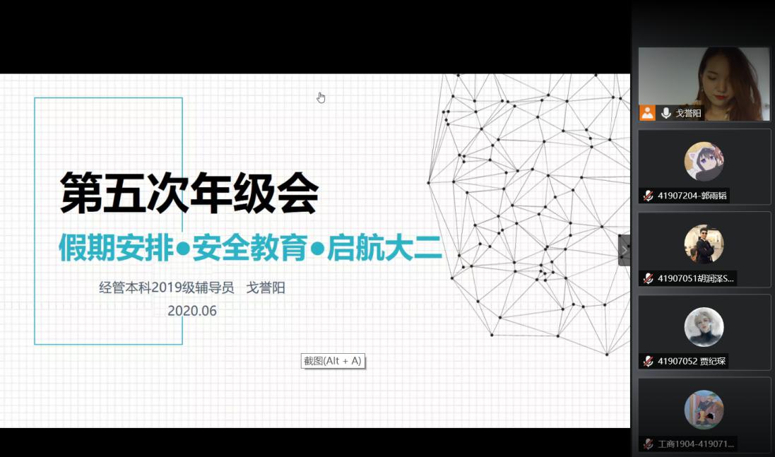 6月26日晚,经管学院本科19级工商管理类在线上召开了“假期安排·安全教育·启航大二”主题年级会,会议由辅导员戈誉阳主持开展,全体工商管理类学生参会。本次会议内容包括宣布暑假安排、进行安全教育,同时为即将踏入大二年级的同学们提出一些建议,帮助同学们合理安排假期,为大二的学习和生活做准备。