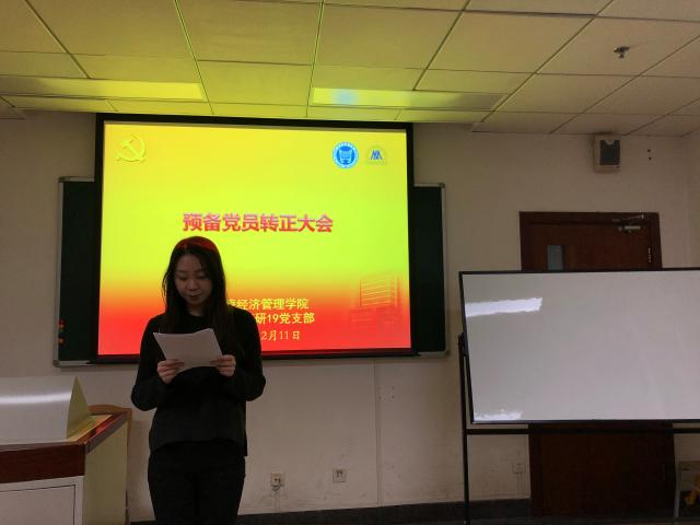 首先三位预备党员分别宣读了转正申请书,对自己一年的状况进行了总结,也指出了自身的不足。李响同志对自己过去一年的前半年作为学生和后半年作为辅导员的工作生活进行总结,希望自己在下一阶段更好地为研究生服务。