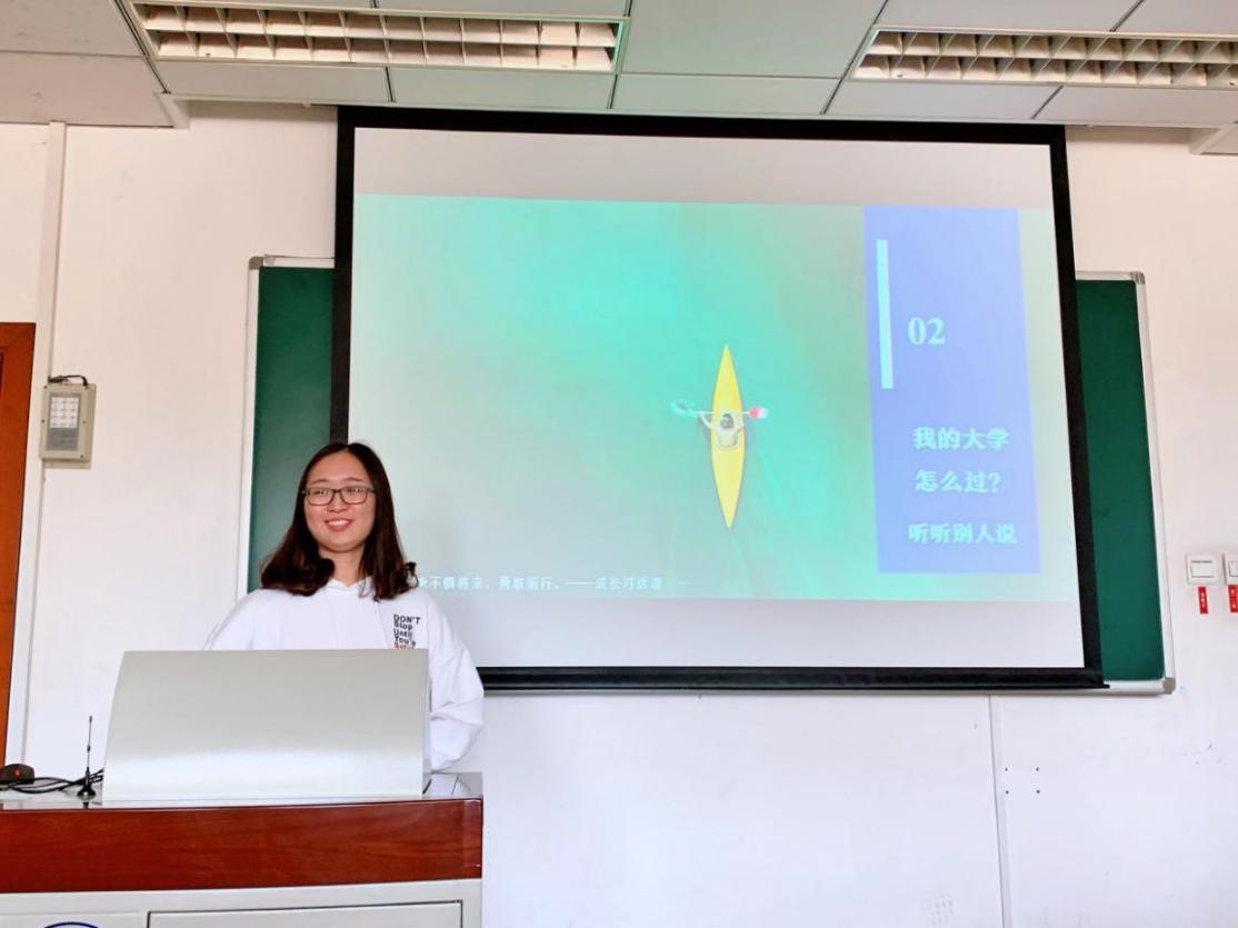随后,倪宇讲述了她对于大学的理解与规划。倪宇提到大学就像一个“聚宝盆”,外部平淡无奇,内在琳琅满目,要得到宝盆里的宝藏就必须自己伸手,不同的人所收获的财富是不同的,让大家明白了只有明确了自己的大方向才能更好的规划自己的生活或寻求外界的帮助这一道理。