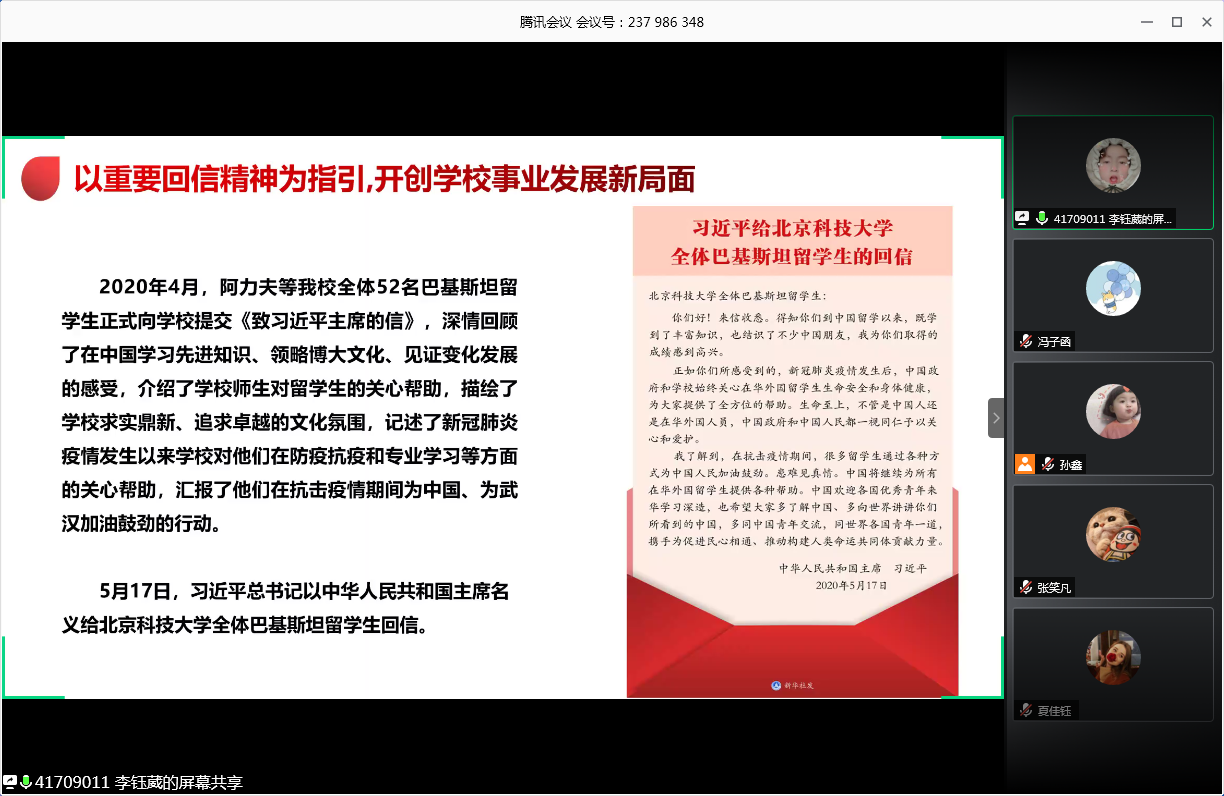 会议的第一部分,由王灏、李钰葳带领大家学习习总书记重要回信精神。在学习中,两位同学带领大家重温习主席给beat365在线唯一官网全体巴基斯坦留学生的回信,学习我校党委书记武贵龙、校长杨仁树就全面深入学习宣传贯彻总书记重要回信精神的部署与要求。