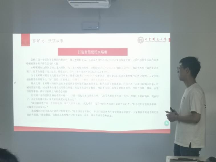 然后陈必凯同学介绍了北科大校友党员徐聚民同志的事迹。徐聚民同志毕业后,深入基层,帮助当地村民发展绿色经济,进行精神文明建设,他创新性地提出了用众筹众创、众扶众督地思路发展农村,与村民村委会同心同力,缓解贫富分化和阶级固化问题,力图打造信息化、现代化的智慧农村,取得了显著效果。