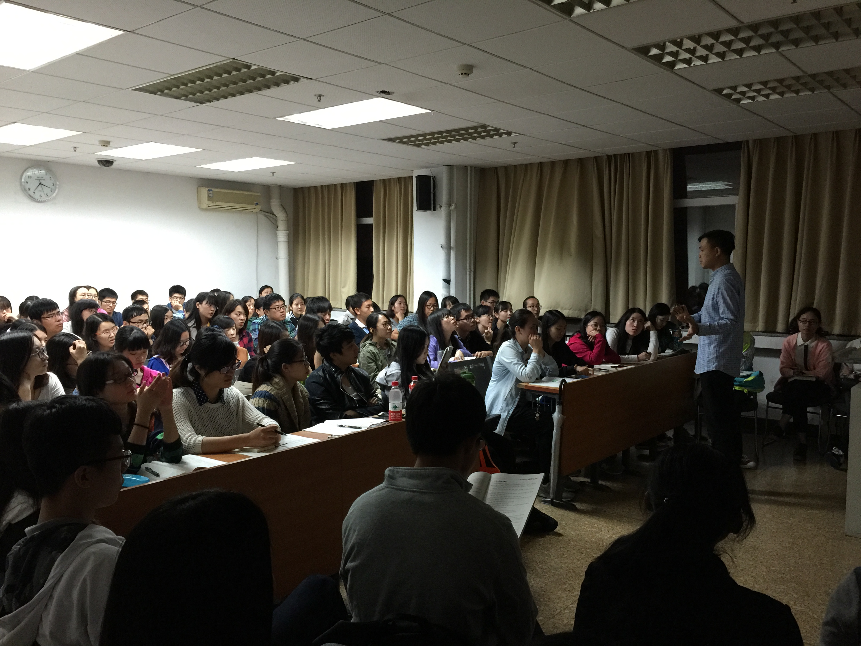 2016年银行秋季校招即将开始,为了提高同学们在银行考试的技能,东凌beat365在线唯一官网联合中公教育开展了东凌beat365在线唯一官网银行秋季招聘备考技能培训活动。本次活动在2015年9月29日管楼507举行,共有100余名同学参加此次培训活动。本次培训活动面向全体对于银行校招有意愿的同学,并且请到了对商业银行和五大行考试的专业知识有系统的钻研,同时具有较强的实战经验和教学经验的杨老师为同学们讲解,活动现场盛况空前,热情高涨的同学使得本不狭小的教室显得拥挤起来。不仅教室里座无虚席,就连过道处和讲台前方都坐满了同学。