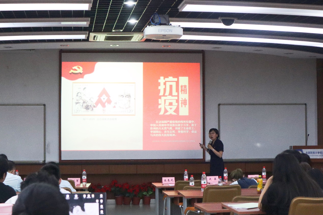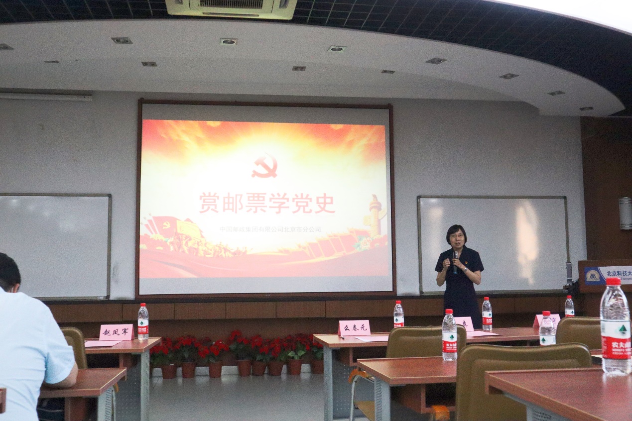 随后北京市邮政教育中心党建和管理教研组长,骨干教师么春元做主题报告。么春元老师通过对“中国共产党成立篇、新中国成立篇、社会主义制度建立与社会主义建设篇、改革开放新时期、中国特色社会主义进入新时代”五部分所对应的邮票的介绍,和大家一起重温了中国共产党的历史。