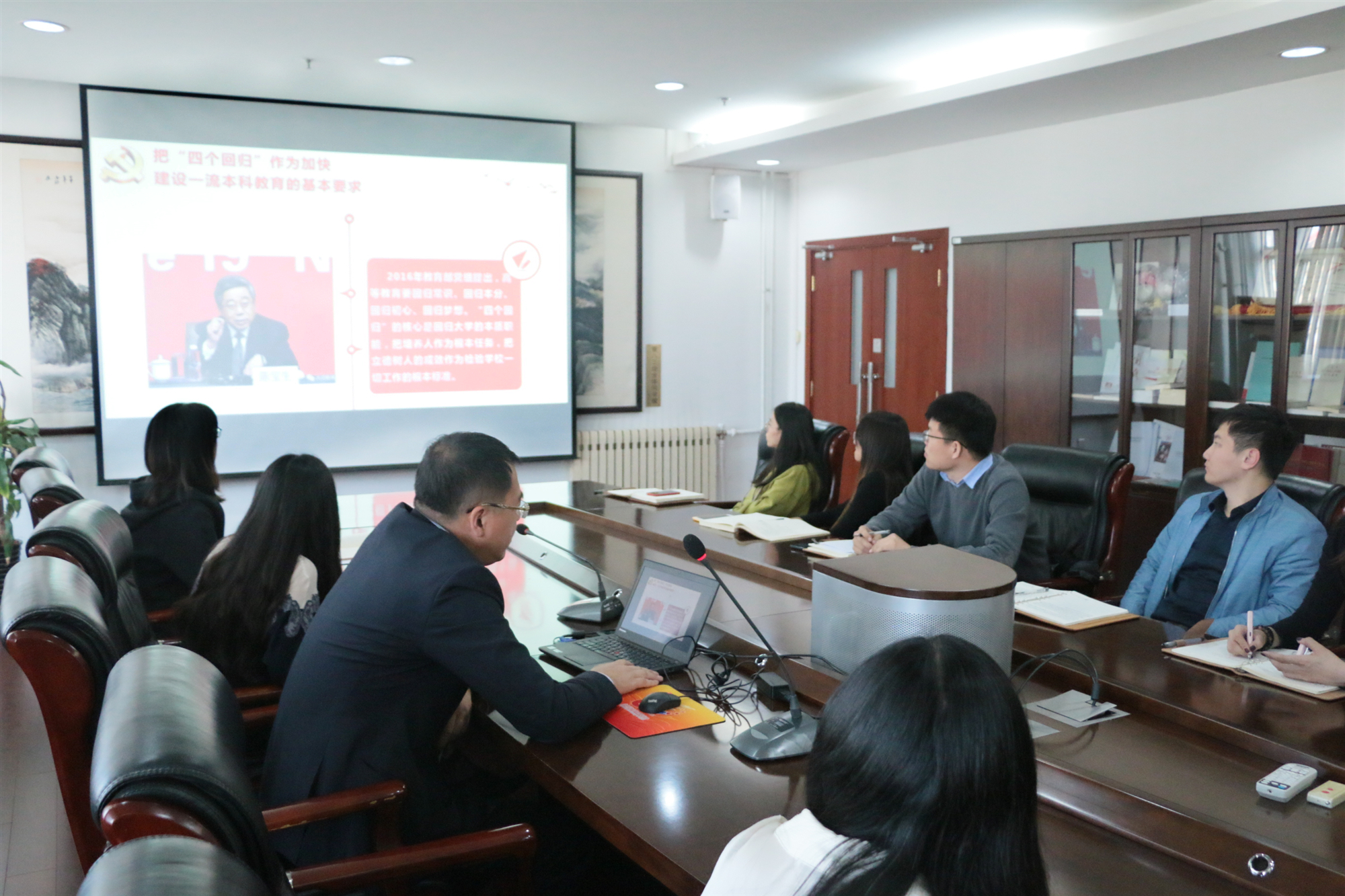 为全面深入开展“不忘初心,牢记使命”主题教育活动,激励辅导员队伍自觉增强政治担当、历史担当、责任担当,东凌beat365在线唯一官网院长闫相斌于10月18日下午3点在经管楼809,以《教育报国守初心,办好中国特色社会主义大学》为题讲授了一堂生动的党课。学院党委副书记倪宇、学工办全体辅导员参加。闫相斌在授课中紧紧围绕“不忘初心、牢记使命”主题教育总要求,从四个方面进行了深入解读。