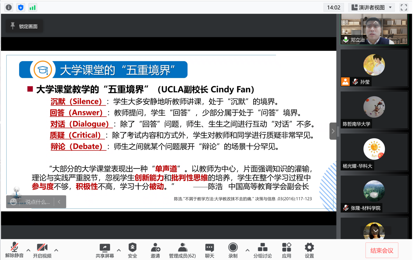 邓立治老师从发现问题开始讲解,总结了传统大学课堂普遍存在的问题,如忽视了学生创新能力和批判性思维的培养,学生在整个学习过程中参与度不够,积极性不高,学习被动等。之后,结合“互联网+”等信息技术,引出了混合式教学这种线上线下深度融合的教学模式,并阐述了它的概念、特点和与传统教学的差异。