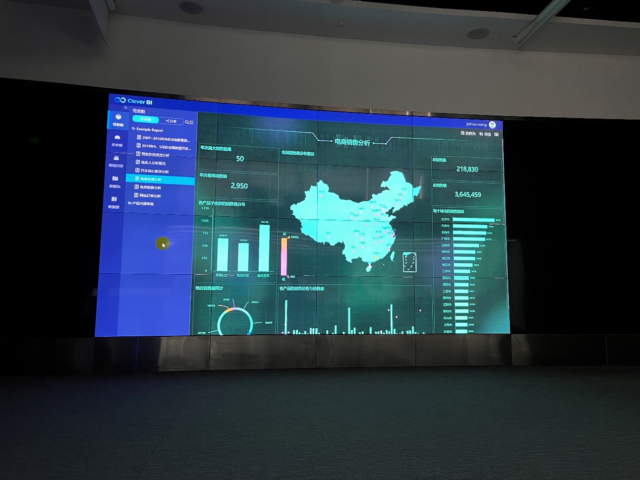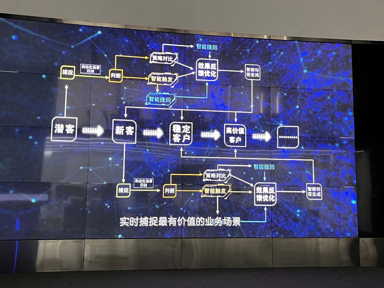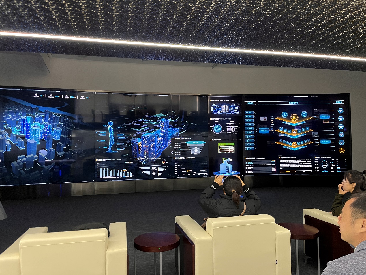 随后,杜博士带领几位老师沉浸式体验了公司的数字智能展示厅,演示了从软件设计搭建到业务设计一键式控制系统,并介绍了企业诸多重点项目:数字城市项目如“北京石景山区城市运营指挥中心”、“丽江城市大脑数据底座”;企业数字化经营决策项目如销量监控、预测、创新品类与新产品投放市场分析等;宏观经济运行趋势、智慧应急管理等专题性研究与建设项目。