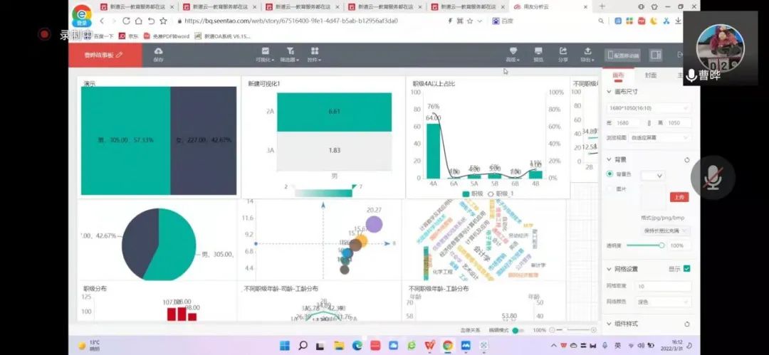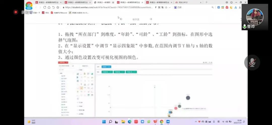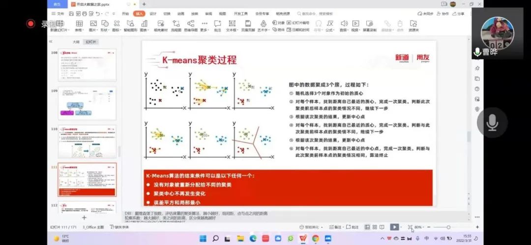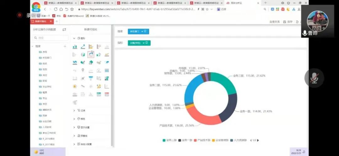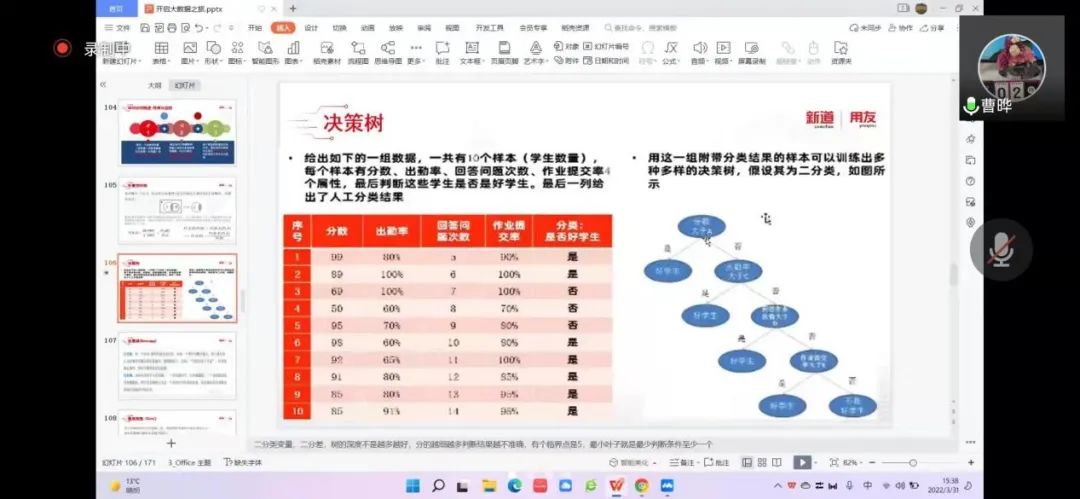 2022年3月31日,beat365在线唯一官网工商管理系“人力资源大数据实践项目”第四次授课如期开始。按照疫情防控期间相关要求,本次授课依旧采取腾讯会议的方式进行。本课程有幸邀请到新道科技股份有限公司高级讲师曹晔进行讲解。第四次授课,曹老师基于知识遗忘曲线的考虑,首先帮助同学们进行了前三节课程内容的回顾与总结,强调了重点和难点。并且本着认真负责的态度,曹老师细心且耐心地询问同学们是否有存疑的地方,并一一解答。确认同学们的掌握情况后,开始今天的新的内容——数据挖掘算法的进一步讲解教学和数据可视化的初步讲解。