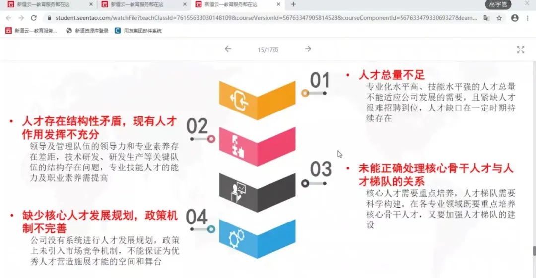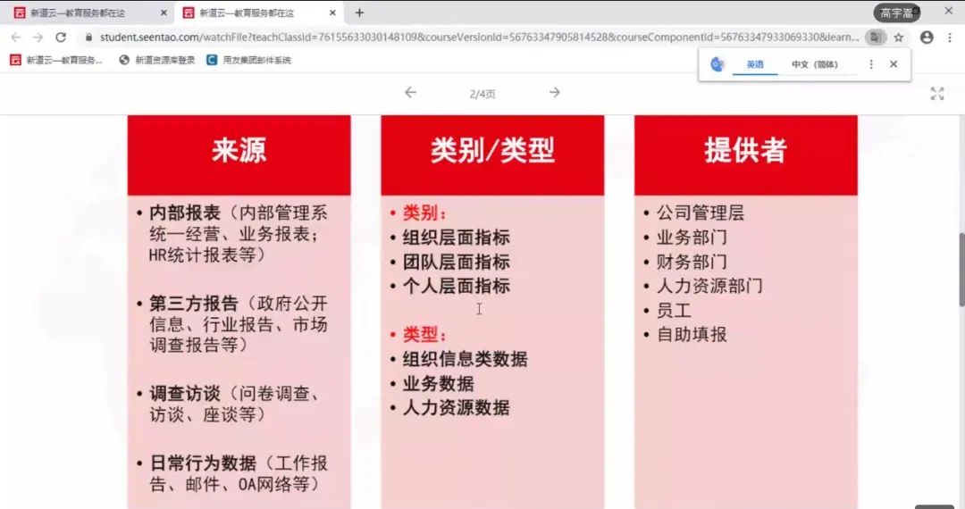 2022年4月21日,beat365在线唯一官网工商管理系“人力资源大数据实践项目”第七次授课如期开始。按照疫情防控期间相关要求,本次授课依旧使用腾讯会议的方式进行,新道科技股份有限公司高级讲师高宇嵩老师进行讲解。高老师主要从三个方面对人才盘点的数据处理进行讲解与演示,首先是业务理解方面的回顾和补充讲解,带领同学们简单回顾上节课讲解的人才盘点业务理解,并对人才盘点发现的问题进行分析举例,加深同学们对人才盘点的理解与认知。在业务理解这一方面,高老师还为同学们提供了确定人才盘点项目分析目标的具体思路,从描述问题、分析问题、分析执行以及目标归类四个角度对人才盘点项目分析目标的确定思路进行详细讲解,并举以实例帮助同学们理解。通过对一份人才盘点的项目分析目标报告的讲解与分析来帮助同学们了解人才盘点项目分析目标的确定。
