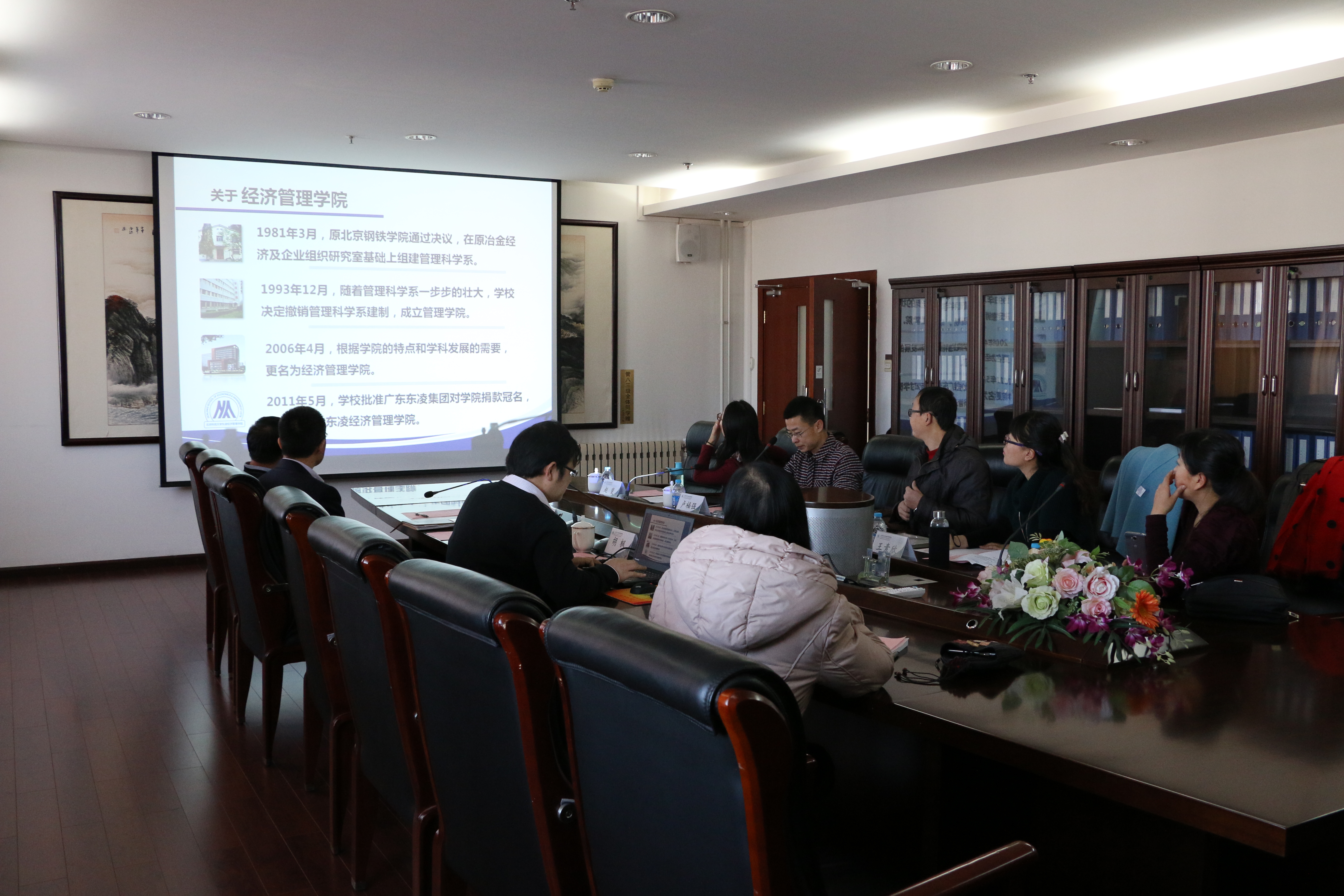 首先,胡枫致欢迎词,欢迎兄弟院校的代表分享他们管理学校团体组织的经验,并介绍我院发展情况。孙朝阳介绍了东北大学秦皇岛分校管理学院的组织架构并通过具体活动强调“细节”的重要性。胡枫分享了专业学习的方法、介绍了该院的人才培养计划,以及利用理论与实践结合的方法解决日常学习中产生的难题。最后,双方老师自由讨论,整场交流会都在一种十分轻松的氛围中进行。