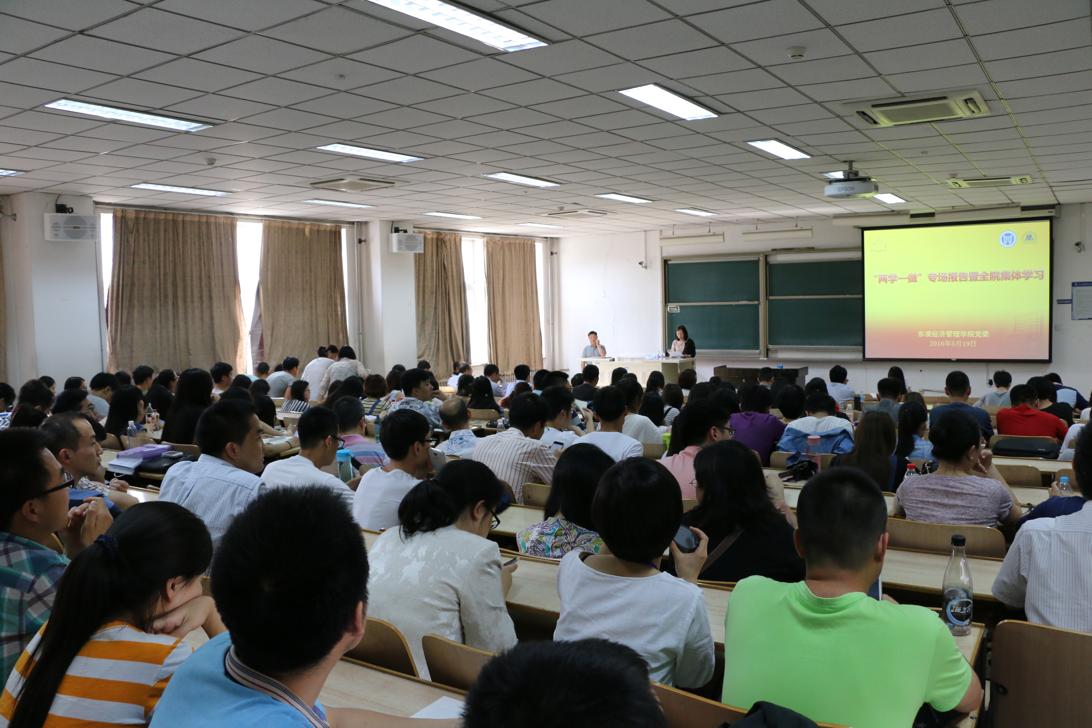 为推动全面从严治党向基层延伸,巩固拓展党的群众路线教育实践活动和“三严三实”专题教育成果,贯彻落实学校党委关于在全体党员中开展“学党章党规、学系列讲话,做合格党员”学习教育的工作部署,5月19日下午,东凌beat365在线唯一官网“两学一做”专场报告暨全院集体学习在逸夫楼105举行,学院党政领导班子成员、党委委员、全体教职工和学生党员代表参加了学习,学院党委书记戴淑芬主持学习会。