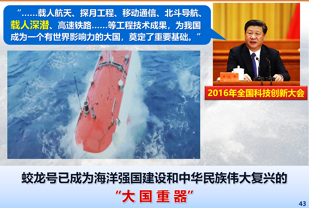刘峰教授首先从战略意义层面分析了研制蛟龙号的背景和思路,深海是国家安全和发展的四大战略新疆域之一,具有人类社会可持续发展的丰富资源,也是大国博弈的重要战场。载人深潜技术历来是深海领域的技术制高点——研制蛟龙号,打造深海利器,是我国进入深海、掌握深海话语权的重大战略决策。
