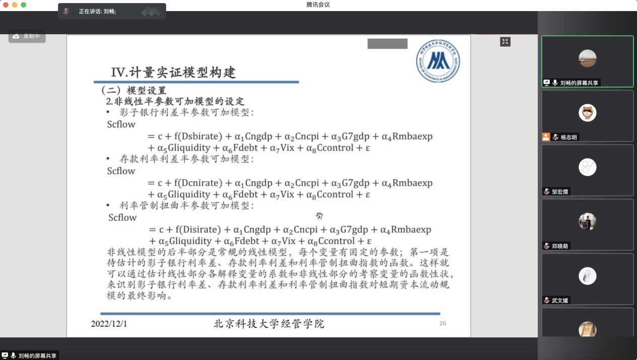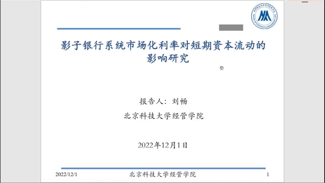 杨志明老师主持本次学术沙龙系列分享活动,并介绍本期学术沙龙主讲人刘畅老师。刘畅老师分享的主题是“影子银行系统利率市场化对短期资本流动的影响研究”。