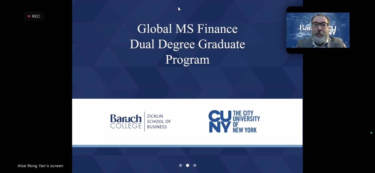 2024年1月8日晚,beat365在线唯一官网与纽约市立大学巴鲁克分校杰克林商学院合办的硕士双学位项目线上宣讲会顺利举办。宣讲会邀请杰克林商学院外联部主任Matt LePere教授和国际项目专员Aloe Rong Yan老师进行项目介绍。我院国际合作与交流办公室赵霞主任、王频频老师以及来自学硕和专硕项目的三十余名学生参与了此次宣讲会。