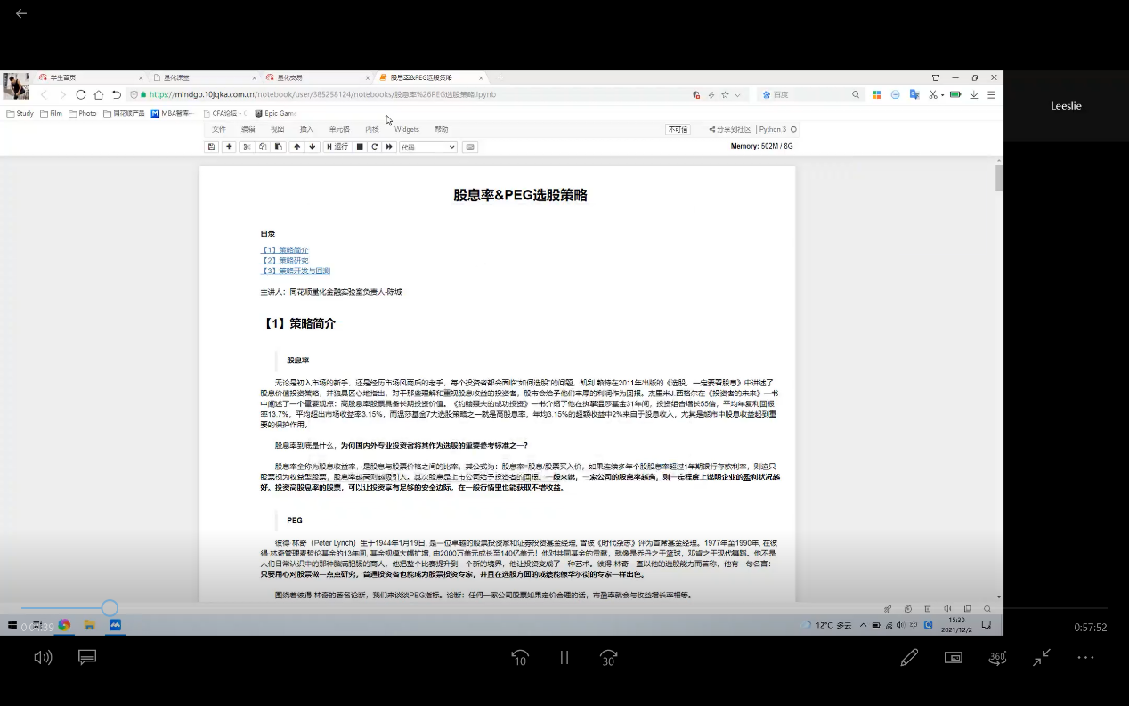 第七期李旭围绕着《股息率&PEG选股策略》进行训练及分享,主要从三个方面展开:第一,股息率&PEG选股策略简介;第二,股息率&PEG选股策略研究;第三,股息率&PEG选股策略开发与回测。