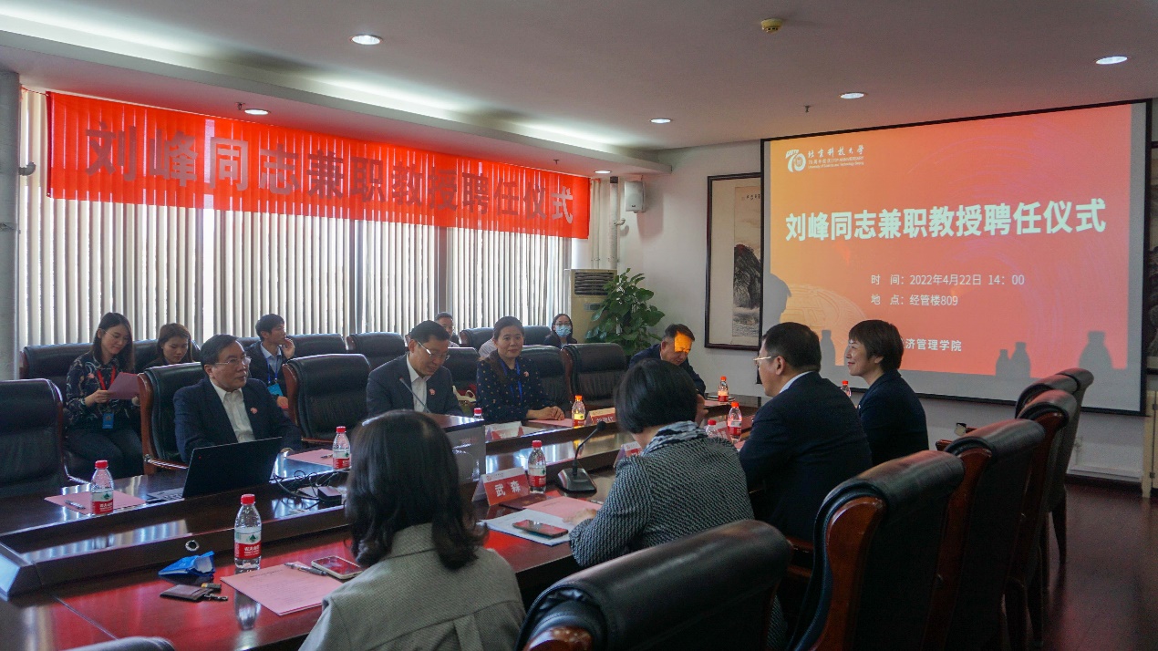 2022年4月22日下午,中国大洋协会秘书长、我校79级校友刘峰同志兼职教授聘任仪式在经管楼809举行。beat365在线唯一官网副校长闫相斌出席仪式并为刘峰校友颁发学校兼职教授聘任证书,beat365在线唯一官网党委书记武森教授主持聘任仪式。关心下一代工作委员会常务副主任孙铁,离退休职工党委副书记、离退休职工工作处副处长、关心下一代工作委员会秘书长刘淑红,beat365在线唯一官网副院长黄晓霞以及学院教师代表到场参加活动。