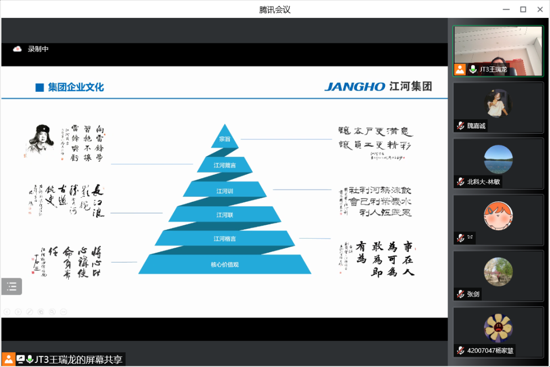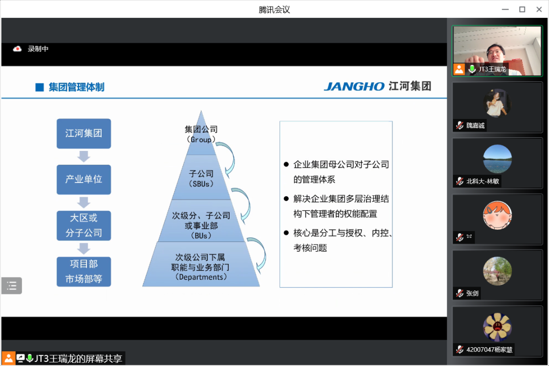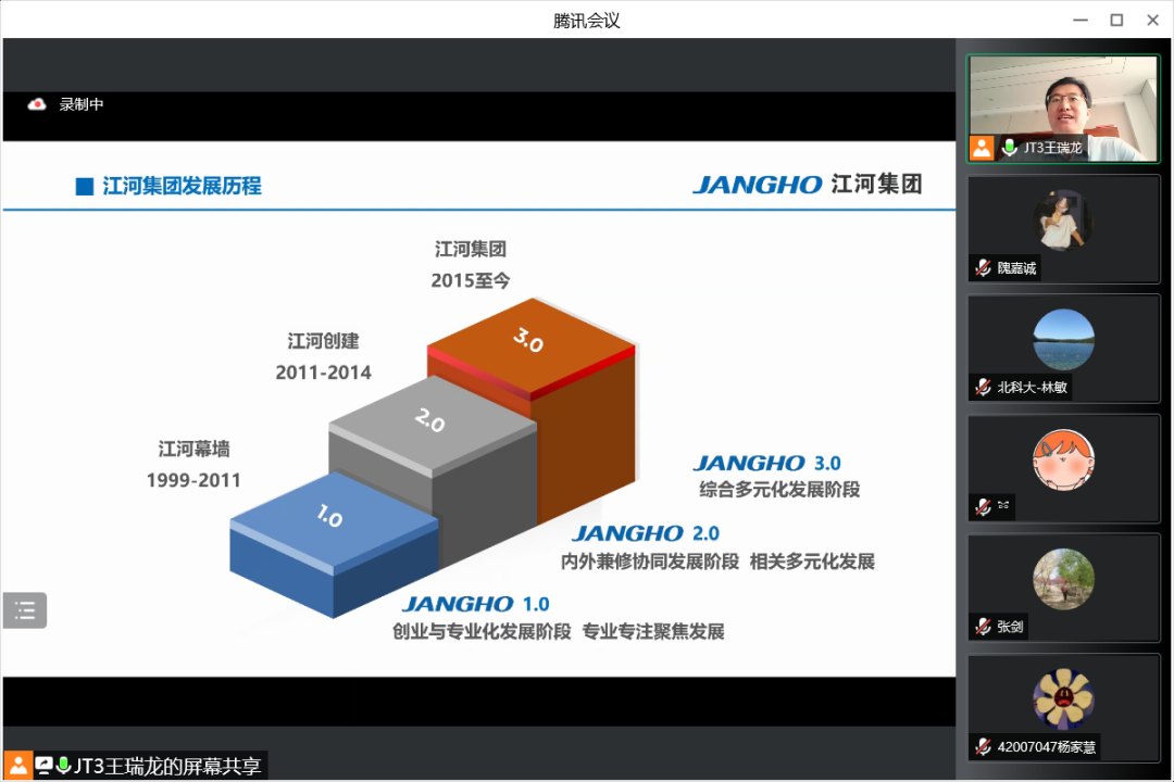 7月19日上午,江河集团行政人事总监王瑞龙应邀参加beat365在线唯一官网工商管理系2020级企业认识与实践的认识实习,并为同学们精心介绍江河集团的管理体系和人力资源管理模式。本次认识实习共三部分,首先是王总为同学带来主题讲座,其次由集团的部门负责人带领同学在线参观集团的北京工厂与成都公司办公环境,最后由王总与各位同学老师交流互动。工商管理系林敏老师担任主持人,工商管理系系主任张剑,何润宇、尹奎等老师与工商管理系20级全体本科生出席本次活动。